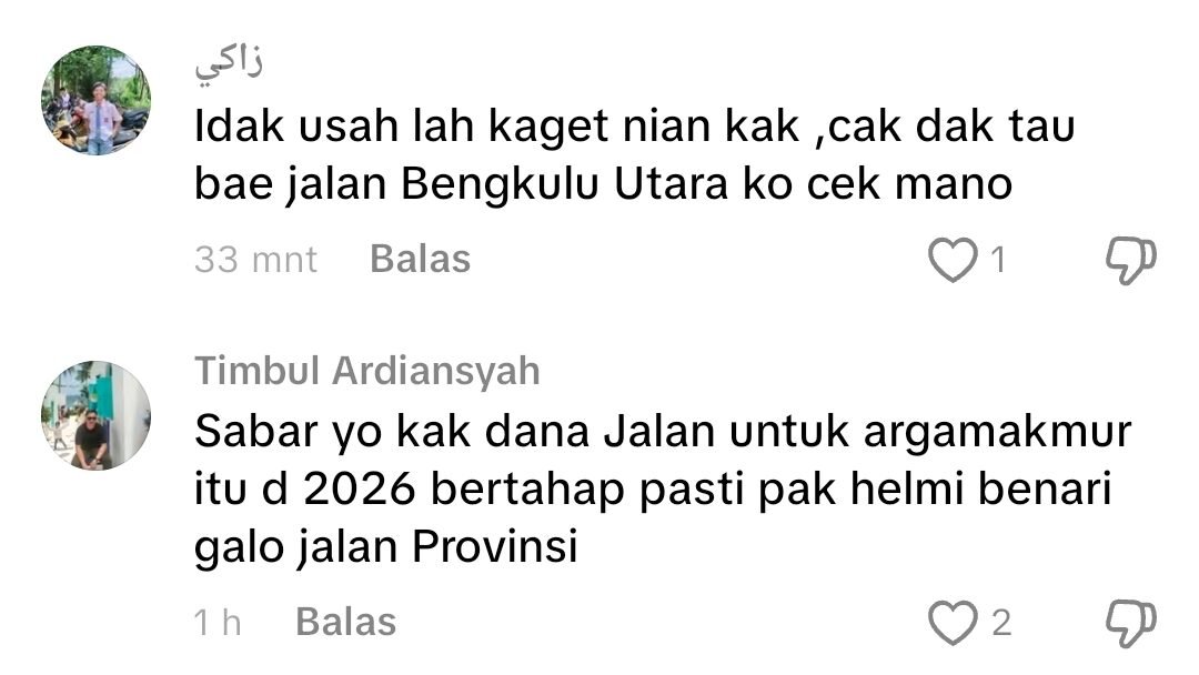 “Sabar Yoh kak dana jalan untuk Argamakmur itu di 2026 bertahap pasti pak Helmi benari galo jalan provinsi,”jelas netizen Timbul Ardiansyah.